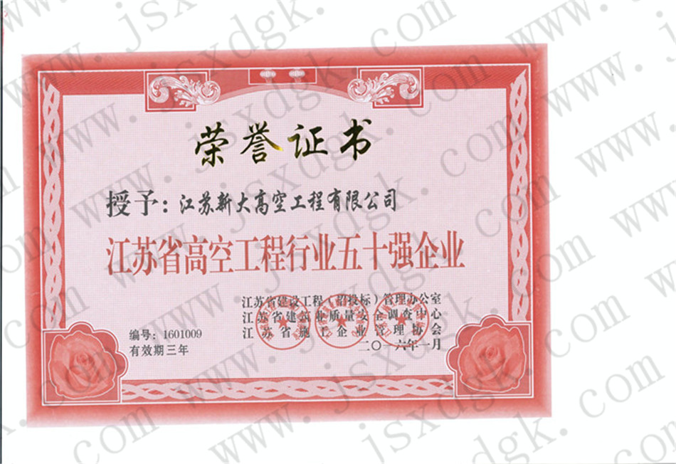 江蘇省高空行業五十強行業證書